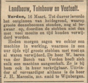 In maart 1907 werd in de buurt van Zutphen een landbouwmachine gedemonstreerd die in een uur tijd vijf stobben van grote dennenbomen uit de grond kon halen, iets dat met de hand een zwaar werk was. De bouwer – en mogelijk de uitvinder – van deze machine was smid Marcelis.
