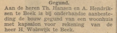 Op 10 november 1947 werd hem een rijksbijdrage uit de Financieringsregeling Woningbouw 1947 toegekend voor de bouw van een woonhuis met kapsalon. Wolswijks schoonvader was een van degenen aan wie de bouw gegund werd. Dit pand aan de Sint Jansgildestraat 41 is daarmee een wederopbouwwoning. Het staat er nog steeds. In dit huis heeft hij zijn heren- en dameskapsalon jarenlang gedreven. In zijn tijd was er nog een kapper in Beek, Johan den Exter.