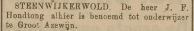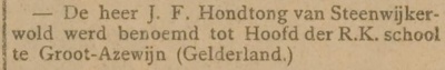 | + | '''Johannes Frederikus (Jan) Hondtong''', meester Hondtong, was van [[1921]] tot [[1959]] hoofd van de [[Sint Jozefschool]] in [[Azewijn]]. Hij werd op 29 april [[1895]] geboren in Steenwijkerwold als zoon van Jan Hondtong en Maria Elshoff. Zijn vader, een Groninger, was gemeenteveldwachter in Steenwijkerwold. | ||