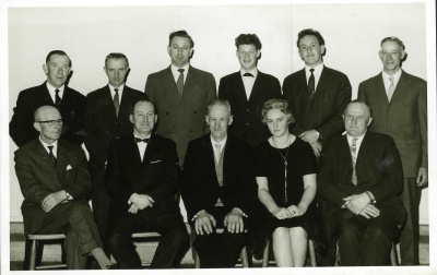 Een foto genomen bij zijn afscheid in 1963. Boven v.l.n.r.: Antoon Ruikes, Antoon Booms, Johan Ampting, Harrie Bosch, Frans Bekker en Willem ten Brink Onder v.l.n.r.: Stève Wennekes, George Schmitz, Toon Messing, mevrouw Schmitz en Bernhard Geurts |