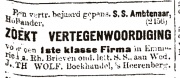 | 2 nov 2010 20:26 | 18-1-1912 ss ambtenaar wolf.JPG (bestand) | 98 kB | Benny Schuurman | Bejaard S.S.Ambtenaar J.TH.Wolf Boekhandel 18-01-1912 zoekt vertegenwoordiging. | 2 | |