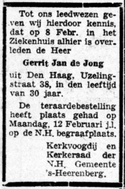 | 15 jul 2014 07:48 | Jongh, GJ de Overl Den Haag.jpg (bestand) | 354 kB | Overlijdensakte van GJ de Jongh, Den Haag, 15 september 1945. Bron www.gemeentearchief.denhaag.nl | 1 | |