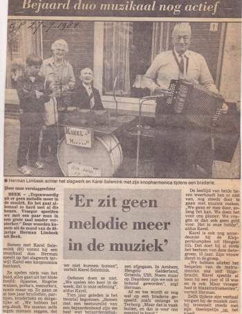 Herman Limbeek en Karel Salemink uit Beek waren twee ouderwetse muzikanten van in de tachtig jaar, die in de regio optraden op allerlei mogelijke muzikale gebeurtenissen. Van braderie tot bruiloft of verjaardagsfeest. Je moest ze wel altijd ophalen en weer thuisbrengen. Hun vergoeding was een aantal borrels tijdens hun optredens. Herman speelde achter het drumstel en Karel met zijn trekharmonica. Het drumstel werd na Hermans overlijden gestationeerd in het gemeenschapshuus De Averhof van de KBO in Beek.