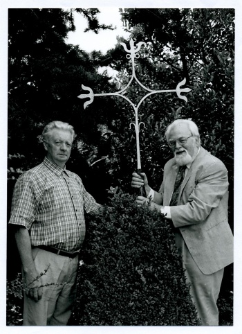 Harrie Godschalk (links) in 1999 met John Thoben en het door hem gerestaureerde hagelkruis.