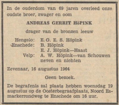 Höpink overleed in Zevenaar op 16 augustus 1964, 69 jaar oud. Op 19 augustus werd hij begraven op de Oosterbegraafplaats in zijn geboortestad Enschede.