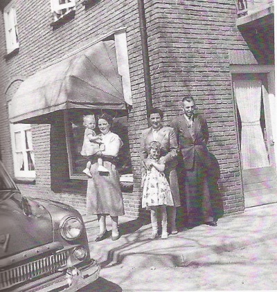 Johan Markhorst eind jaren 50 voor zijn huis aan de Kilderseweg in Zeddam met zijn vrouw (links), dochters Maria en Ellie en zijn schoonzus An (midden) uit Millingen. De deur rechts is later dichtgemetseld, maar het balkon daarboven is er nog.