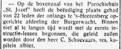 Op 7 mei 1937 werden in het parochiehuis Sint Jozef 22 leden van de kort daarvoor opgerichte burgerwacht beëdigd. Reservekapitein Schoevaars was de commandant van deze burgerwacht. Het bestuur bestond uit pastoor Galama, J.G. Wilmes en H. van Uhm.