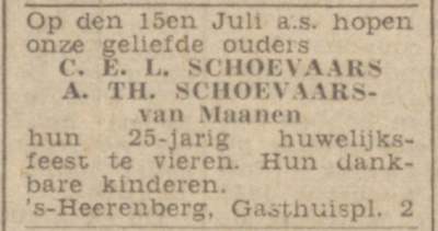Eind 1923 is Schoevaars met zijn gezin verhuisd naar Gasthuisplein 2 in 's-Heerenberg, waar hij een tijdelijke aanstelling had gekregen als leraar wiskunde bij het r.-k. ULO. Per 17 november 1924 kreeg hij een vaste aanstelling, waarna hij aan deze school heeft lesgegeven tot 1939.