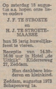 Jan te Stroete en zijn vrouw tijdens de viering van zijn 25-jarig jubileum in 1971.