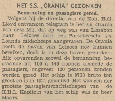 De aanvaring veroorzaakte een groot gat in de romp. Door binnenstromend water maakte het schip zo snel slagzij dat de reddingsboten niet meer gestreken konden worden. Maar al snel kwamen allerlei vaartuigen te hulp, die ook enkele opvarenden uit het water oppikten. De Orania zonk in een half uur. Het schip was niet meer te redden en werd enkele weken later met behulp van explosieven opgeruimd.