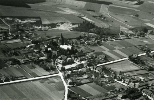Deze luchtfoto van Zeddam, gemaakt door Aerofoto K.L.M., stond in het katern De Achterhoek van de Graafschapbode van 15 februari 1952. Het bijschrift luidt: Op deze luchtfoto van Zeddam missen we helaas de bekende oude molen. Duidelijk komt de verspreide komvorming tot uitdrukking. Geheel rechts de boterfabriek met daaronder het nog steeds niet gerestaureerde Majellagesticht. Rechts van dit gebouw is op de foto nog net zichtbaar de Padevoort. Klik op de foto's voor een vergroting. |