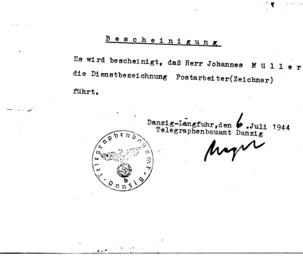 | + | Op 6 juli 1944 gaf het postkantoor in de Danziger wijk Langfuhr (nu Wrzeszcz) een eenvoudig certificaat af ter bevestiging dat Müllers beroep ''Postarbeiter (Zeichner)'' was. Het doel hiervan is niet meteen duidelijk, want hij was nog steeds in militaire dienst. Van 28 juli tot 12 augustus 1944 was hij weer in Tiegenhof; dit keer met ''Einsatzurlaub''. Er zijn geen gegevens voorhanden over de plaats waar hij na zijn verlof werd ingezet, maar waarschijnlijk was het ergens in Nederland. | ||