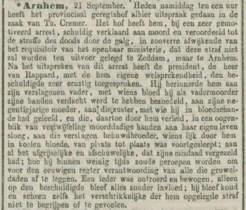 Al een maand na zijn uitlevering werd Kremer op 21 september 1852 door het gerechtshof in Arnhem veroordeeld tot de dood door ophanging. De eis was het vonnis in Zeddam te voltrekken, maar de rechter besliste dat dit in Arnhem moest gebeuren. Na het uitspreken van het vonnis heeft de voorzitter van het gerechtshof, mr. Van Rappard, Kremer ernstig toegesproken. Hij herinnerde Kremer niet alleen aan de moord, zelfmoord, incest en brandstichting die met zijn veroordeling in verband stonden, maar ook aan het feit dat hij verdachte was in de niet opgeloste moord op zijn vader. Kremer hoorde alles onbewogen aan.