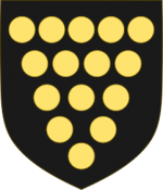 | + | <br/>''In zilver een leeuw van keel, getongd, genageld en gekroond van goud, en een schildzoom van sabel, beladen met negen bollen van goud.''<br/> | ||