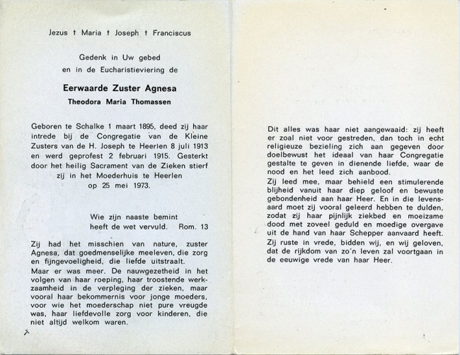 | + | [[Bestand:Thomassen_agnesa.jpg|650px|right|thumb|'''Bidprentje van Zuster Agnesa.''']] | ||