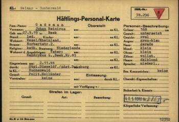 | + | |[[Bestand:Gademan Jan - Buchenwald.jpg|thumb|350px|<center>'''Gademans ''Häftlings-Personal-Karte''<br>uit Buchenwald</center>]] | ||