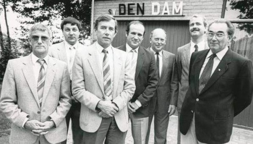 | + | [[Bestand:Bestuur Den Dam 1985.jpg|right|500px|thumb|'''Het bestuur van Den Dam in 1985 ter gelegenheid van het 40-jarig bestaan. V.l.n.r. Frans Bekker, Leo Kock, Guus Ketelaar, Rudi Klein-Obbink, Alex Berntsen, Appie Hendriksen en [[Berntsen, Wilhelmus Clemens|Wim van Clé]].]] | ||