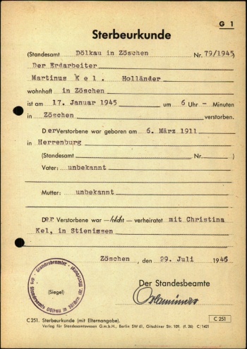 In Zöschen is op 29 juli 1945 een Sterbeurkunde voor Kel opgemaakt, waarna zijn overlijden op 9 mei 1946 werd ingeschreven in Doetinchem.