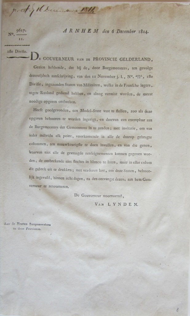 Na ontvangst van UHooggeboren missive in d:d: 11/19 november [...] No 9011/14 | 1st Divisie heb ik de weldadige oogmerken des inhouds aan de ingezetenen bekend gemaakt van welke weinige wisten iets bepaalds van de vermiste personen die tegen Rusland te velde getrokken waren op te geven en verzogten tijd om er zig na te kunnen informeren waar omtrent ik zelfs zonder van de meeste nog veel voldoende te hebben bekomen.