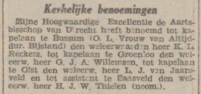 | + | |[[Bestand:Pastoor Van Jaarsveld 19410820 NBvhN.JPG|400px|thumb|'''In deze lange lijst van benoemingen in het ''Nieuwsblad van het Noorden'' van 20 augustus 1941 wordt Van Jaarsveld als laatste genoemd.]] | ||