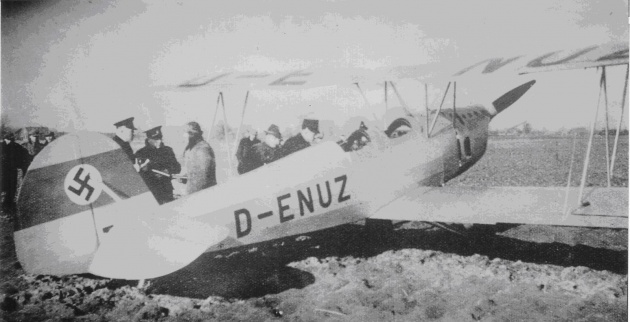| + | |[[Bestand:Heinkel He 72.JPG|thumb|630px|'''Veldwachter Moorman, tweede van links, op 16 februari 1938 bij de Duitse dubbeldekker]] | ||