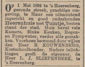 | + | |[[Bestand:Sliepenbeek 18920412 NvdD.jpg|thumb|350px|'''Advertentie van Sliepenbeek voor de verhuur van een pand dat hij in 's-Heerenberg bezat. Uit ''Het Nieuws van den Dag'' van 12 april 1892]] | ||