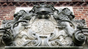 1. Het alliantiewapen van graaf Oswald III en zijn vrouw boven de hoofdingang op het bordes van Huis Bergh