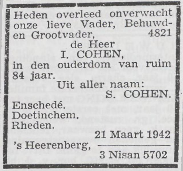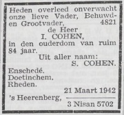 | 4 feb 2011 08:22 | Izaak Cohen Joodsch Wkbld 19420327.jpg (bestand) | 53 kB | Overlijdensadvertentie voor Izaak Cohen in Het Joodsch Weekblad van 27 maart 1942 | 1 | |