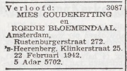 | 4 feb 2011 12:36 | Bloemendaal-Goudeketting Joodsch Wkbld 19420227.jpg (bestand) | 48 kB | Afkondiging van de verloving van Roidi Bloemendaal en Mietje Goudeketting in Het Joodsch Weekblad van 27 februari 1942 | 1 | |