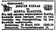| 23 feb 2011 15:53 | Pienas-Slagter 19150318 NRCavond.jpg (bestand) | 85 kB | Dankbetuiging bij het huwelijk van Meijer Pienas en Greta Slagter in de avondeditie van de NRC van 18 maart 1915 | 1 | |
