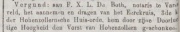 | 11 mrt 2012 15:24 | FXL de Both 18750717 Tijd.jpg (bestand) | 487 kB | Aankondiging van de verkoop van grond van Huis Bergh in dagblad De Tijd van 17 juli 1875. De verkoop wordt uitgevoerd door notaris FXL de Both. De ondertekening is door adminstrateur Jospeh Grimm. Bron: http://kranten.kb.nl | 1 | |