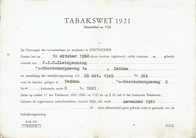 | 30 okt 2018 23:53 | Kleinpenning F 1961 Tabakswet Sigarenmagazijn Zeddam.jpg (bestand) | 33 kB | 1961 Tabakswet Sigarenmagazijn Frans Kleinpenning i.v.m. verplaatsing winkel naar 's-Heerenbergseweg 1A te Zeddam | 1 | |