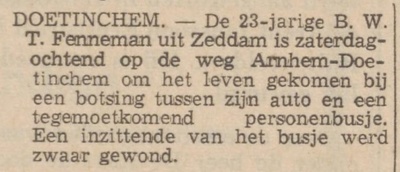 Bernardus Wilhelmus Theodorus (Bennie) Fenneman is op 2 augustus 1969 dodelijk verongelukt op de weg tussen Arnhem en Doetinchem.