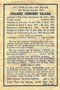 Jan Galama werd op 6 maart 1910 in Utrecht tot priester gewijd. Kort daarna droeg hij zijn eerste Heilige Mis op in zijn geboorteparochie Blauwhuis. Vervolgens werd hij per 13 mei 1910 assistent in Zevenaar en per 7 april 1911 in Soest. Per 28 augustus 1914 werd hij daar kapelaan, tot zijn overplaatsing naar Dalfsen, waar hij op 14 mei 1926 pastoor werd. Vandaar kwam hij op 30 januari 1932 naar 's-Heerenberg, waar hij tot zijn dood pastoor was van de H. Pancratius-parochie.