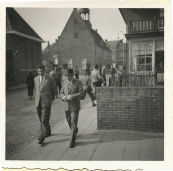 !956 dhr. Scholten en dhr. De Boer op de pauze plaats voor de Mulo, rechts het huis van de heer Scholten en boven op de foto het gasthuisplein