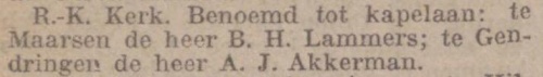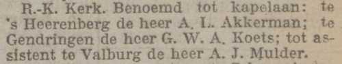 Op 2 september 1927 vertrok Akkerman uit 's-Heerenberg en werd pastoor in Dedemsvaart. Later werd hij pastoor in Hilversum. In 's-Heerenberg werd hij opgevolgd door kapelaan Graafsma.