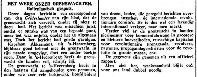De eerste jaren na de Eerste Wereldoorlog brachten ook voor Nederland nog enige onrust. In 1920 werd in Bergh zelfs de Bijzondere Vrijwillige Landstorm opgeroepen. Ook de Grenswacht had een en ander te doen. In november 1919 verscheen hierover een bericht in dagblad Het Centrum dat was gebaseerd op gegevens die kapelaan Akkerman had verstrekt. Het artikel wekte zo veel bezorgdheid dat er vragen over gesteld werden in de Tweede Kamer. De betreffende ministers antwoordden dat het ze erg allemaal niet was. Had kapelaan Akkerman zich iets laten aanpraten, of had de krant zitten overdrijven?