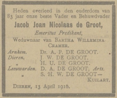 Hij overleed op 13 april 1916 in Dieren, 83 jaar oud.