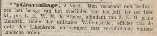 De Stuers overleed op 31 maart 1869 in Den Haag, nog maar 39 jaar oud. Zij vrouw overleed op 16 februari 1888, 46 jaar oud.