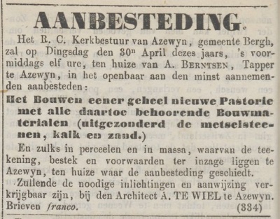 Eerst maakte de befaamde Azewijnse architect Arnold te Wiel een begroting: hij had in de streek al meer pastorieën gebouwd. Zijn becijfering kwam uit op ƒ 6295,00. - Langs de huizen in Azewijn werd een collecte gehouden voor de pastorie en die bracht circa ƒ 1500,00 op. Namens het kerkbestuur schreven Jacobus Hoegen en Bernardus Beijer op 18 april 1867 een brief aan de Vorst van Hohenzollern, graaf van Bergh. Wat die precies heeft bijgedragen, weet ik niet, maar hij heeft zich vast - zoals altijd - van zijn beste kant laten zien.