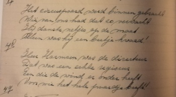 Deze strofes refereren duidelijk naar de twee foto’s van het circuspaard en circusdirecteur Willem Hermsen. Er was soms ontspanning, zoals theatervoorstelling. In Lager Mangold speelde iedere zondag een orkest van Lagerbewoners populaire muziek en was er gelegenheid tot dansen. Op 24 december 1944 werd in Lager Mangold een kerstbijeenkomst gehouden voor de buitenlanders, aanvang 17.00. Als onderdeel 16: Circuspferd. Willem speelde mee in deze act als circusdirecteur.