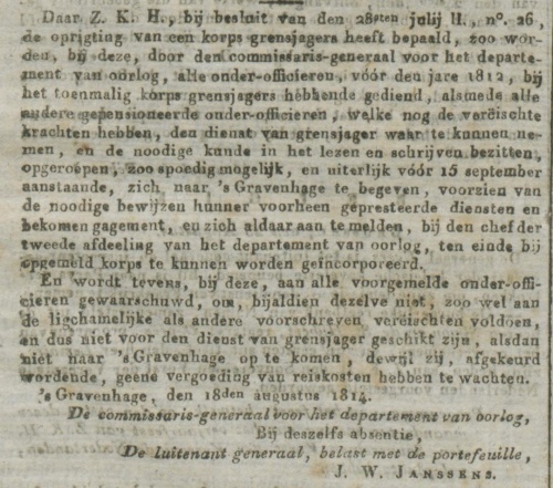 De eerste oproep aan onderofficieren voor aanmelding bij het Korps Grensjagers in de Nederlandsche Staatscourant van 27 augustus 1814