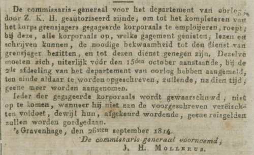 De oproep aan korporaals voor aanmelding bij het Korps Grensjagers in de Nederlandsche Staatscourant van 1 oktober 1814