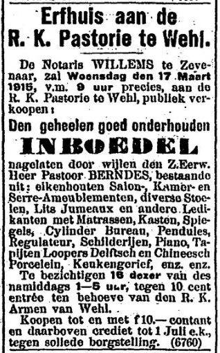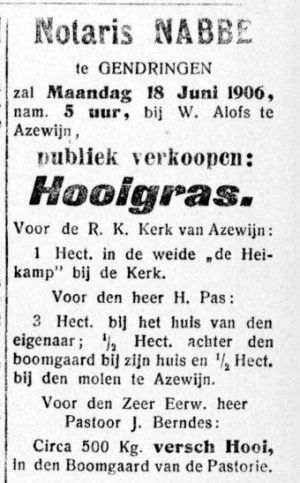 Notaris Nabbe verkocht vers hooi voor pastoor Berndes persoonlijk. Advertentie uit de Graafschapbode van 9 juni 1906.