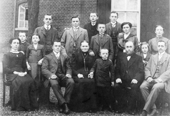 Het gezin Berntsen-Wellen omstreeks 1915. De nummers verwijzen naar onderstaande lijst. V.l.n.r. achteraan: Joep (10) en Lou (7). Staande daarvoor: Jan (4), Clé (6), Felix (9), Marie (8) en Alei (3). Zittend daarvoor met tussen hen in staande de jongste kinderen: Ida (2), Theet (11), Agnes (12), Paul (5), moeder Johanna, Frans (14), vader Willem, Gonda (13) en Bart (1).