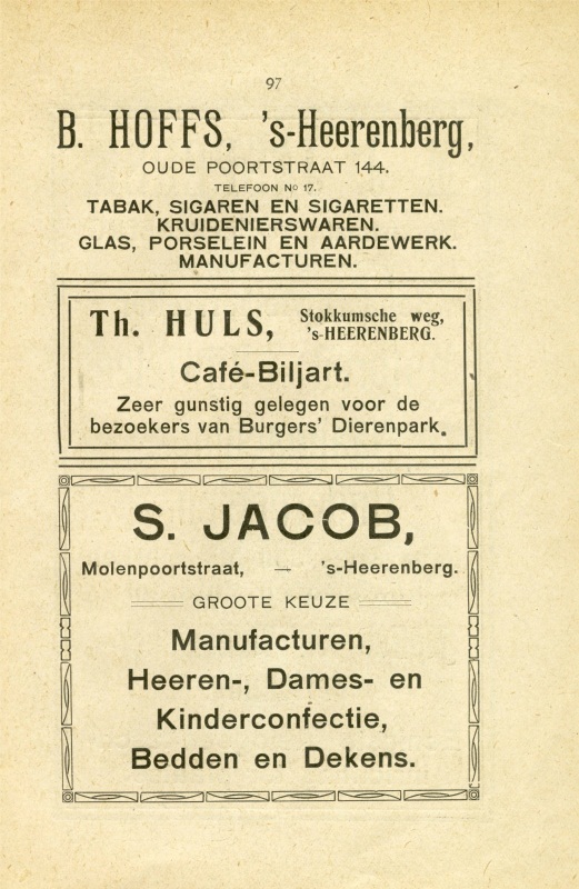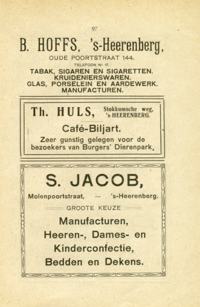 B. Hoffs oudstepoortstraat van tabak tot manufacturen. Th.Huls stokkumseweg Cafe Biljart, gunstig gelegen voor Burgers Dierenpark. S.Jacob van manufacturen tot bedden en dekens. blz 97