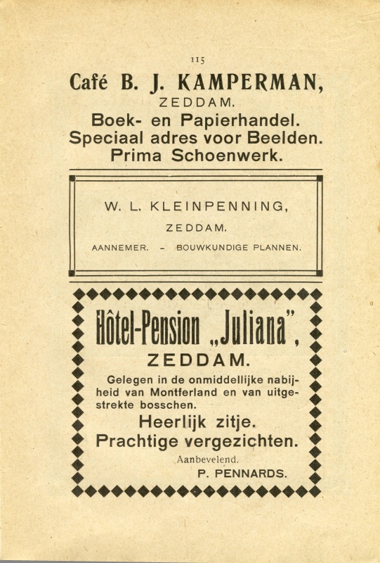 b.J.Kamperman Boek en Papierhandel. W.J.Kleinpenning Aannemen bouwkundige plannen.Hotel Pension juliana P.Pennards Zeddam. blz 115