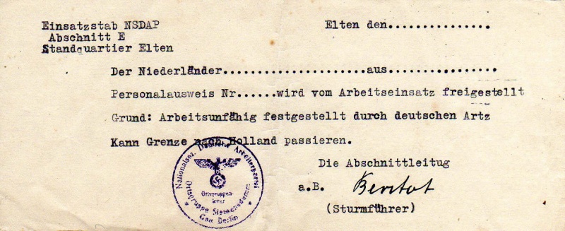 Vervalst formulier (uit het archief van Clemens Berntsen) dat vrijstelling van de Arbeitseinsatz gaf. Vanwege de (vervalste) handtekening van Sturmführer Bentot werden de formulieren "Bentotjes" genoemd.