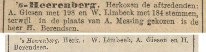 Berichten over Hermanus Berendsens verkiezing tot gemeenteraadslid in het Algemeen Handelsblad van 18 juli 1889 en zijn herverkiezing in Het Nieuws van den Dag van 20 juli 1895