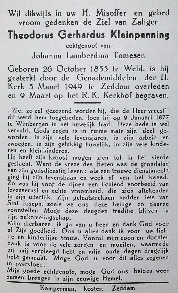 Bidprentje Theodorus Kleinpenning, 1855-1949